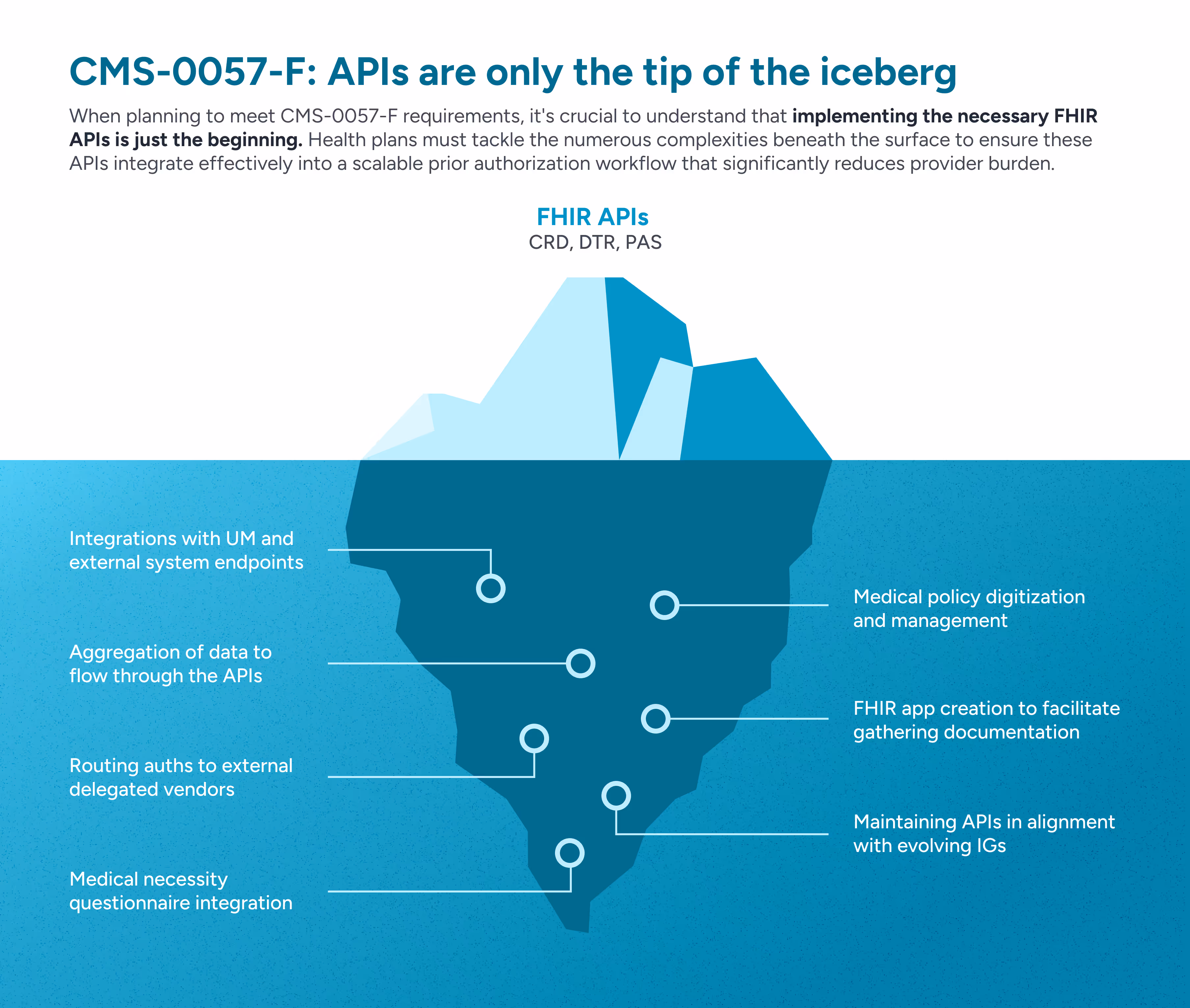 Implementing CMS-0057-F, which mandates using FHIR APIs for prior authorization (PA) workflows, is a critical step forward in streamlining administrative processes and reducing provider burden. While the requirement to adopt FHIR APIs—specifically the CRD (Coverage Requirements Discovery), DTR (Documentation Templates and Rules), and PAS (Prior Authorization Support)—is a well-publicized aspect of the rule, it’s essential to understand that this is just the tip of the iceberg.